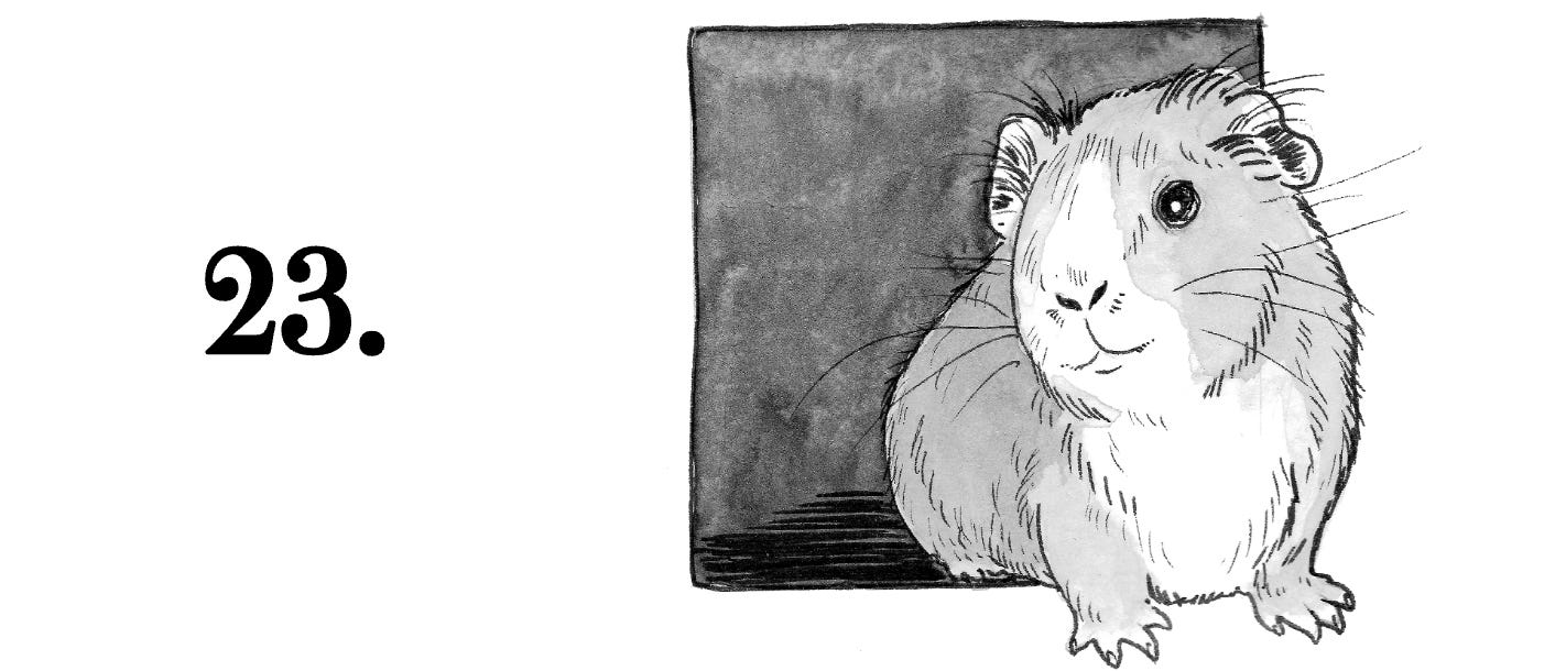 Nous faisons cercle. Le cochon d’Inde gesticule en roulant des yeux fous. C’est comique et effrayant à la fois.